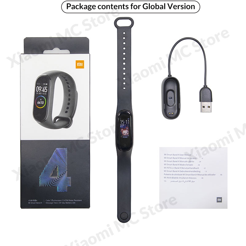 Main Features : Xiaomi Mi Band 4 Support Multi-Language* Screen: 0.95″ , resolution : 240×120 pixels. * Alarm ( Set in Application | Snooze Mode: 10 or 15 minutes). * Sensor: 3-axis gyroscope. * Maximum set 50 Event reminders. * Battery: 135 mAh battery, Up-to 20 days (Recharging approximately time 2 Hours) * System requirement – iOS 9, Android version 4.4 and above. * It supports Music Smart Control. * Six Sports Activities (Cycling, Running, Free training, Swim, Walking, Treadmill, Swim)