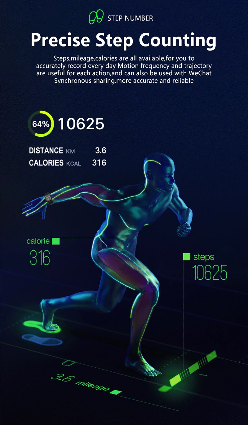 Bracelet presentation work: time show, battery symbol show, date show, week show, standard movement work (step, separation, calorie) multi-sport mode (strolling, running, cycling, skipping, badminton, b-ball) , football, swimming), pulse, circulatory strain location, blood oxygen discovery, rest time show, screen brilliance adjustment, music control.