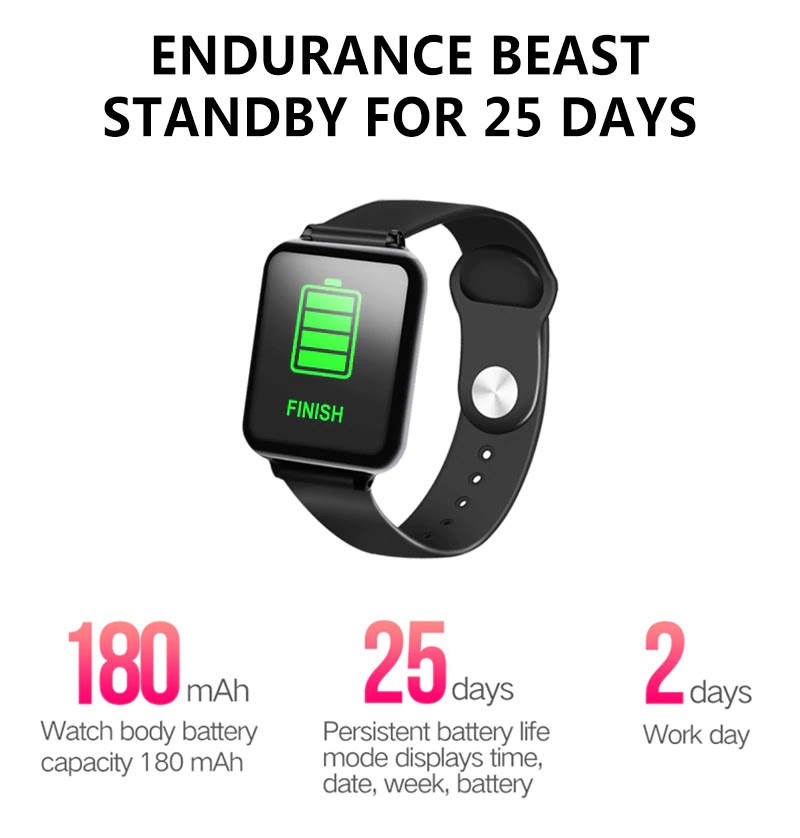 With its 180 mAh lithium polymer battery, the smartwatch has 25 days of reserve time.