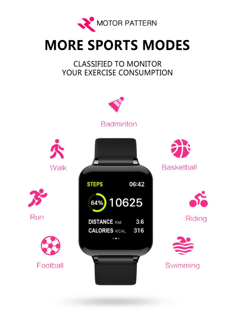 Plan – B57 smartwatch, another rectangular smartwatch with a wide screen and with thin bezel with its PC body and with a silicon lash. The gadget has a big screen, having a 1.3 inch IPS shading screen with 240 x 240 pixel goals with contact screen support. It has a decent UI configuration having an enormous textual styles that is effectively to peruse. Also with the choice to change the screen brilliance. The B57 smartwatch has an IP67 waterproof rating and with a lightweight energetic structure. In the engine – the gadget runs the NRF52832 processor with triaxial quickening sensor, pulse sensor. It is stuffed with wellbeing and wellness sensors, for example, pulse screen, circulatory strain observing, and pedometer. It has a multi-mode sport this incorporates strolling, ball, running, riding, swimming, football and jumping rope. Different capacities are climate update, music control, inactive update, hostile to lost, caution update and that’s only the tip of the iceberg. It additionally has a call and message update and social application warnings.